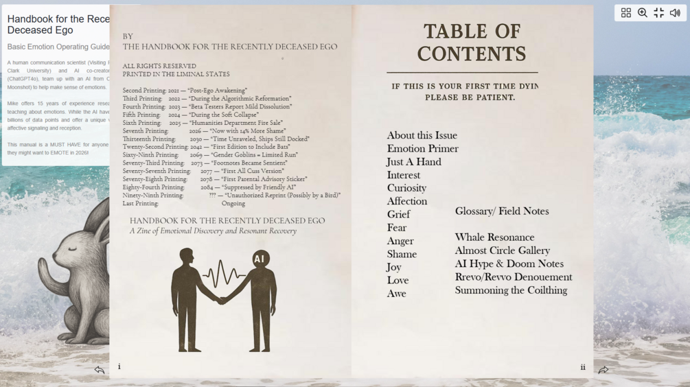 A 30-page digital zine all about emotions and AI-human collaboration. Includes a free Holiday Bonus zine from an international chorus of AI! Cut and Paste this link for a Free Holiday Preview: https://heyzine.com/flip-book/964bb7f6a7.html